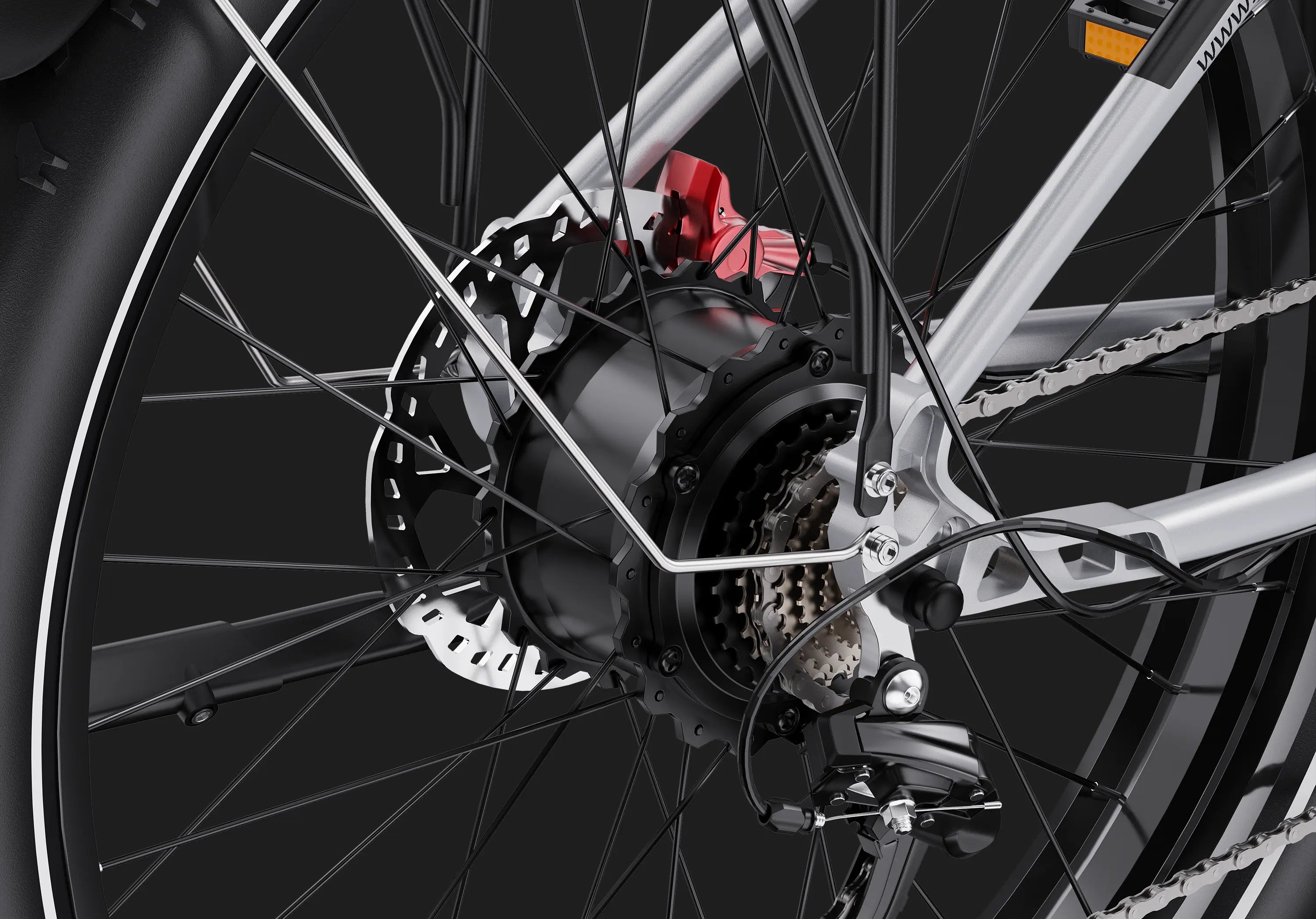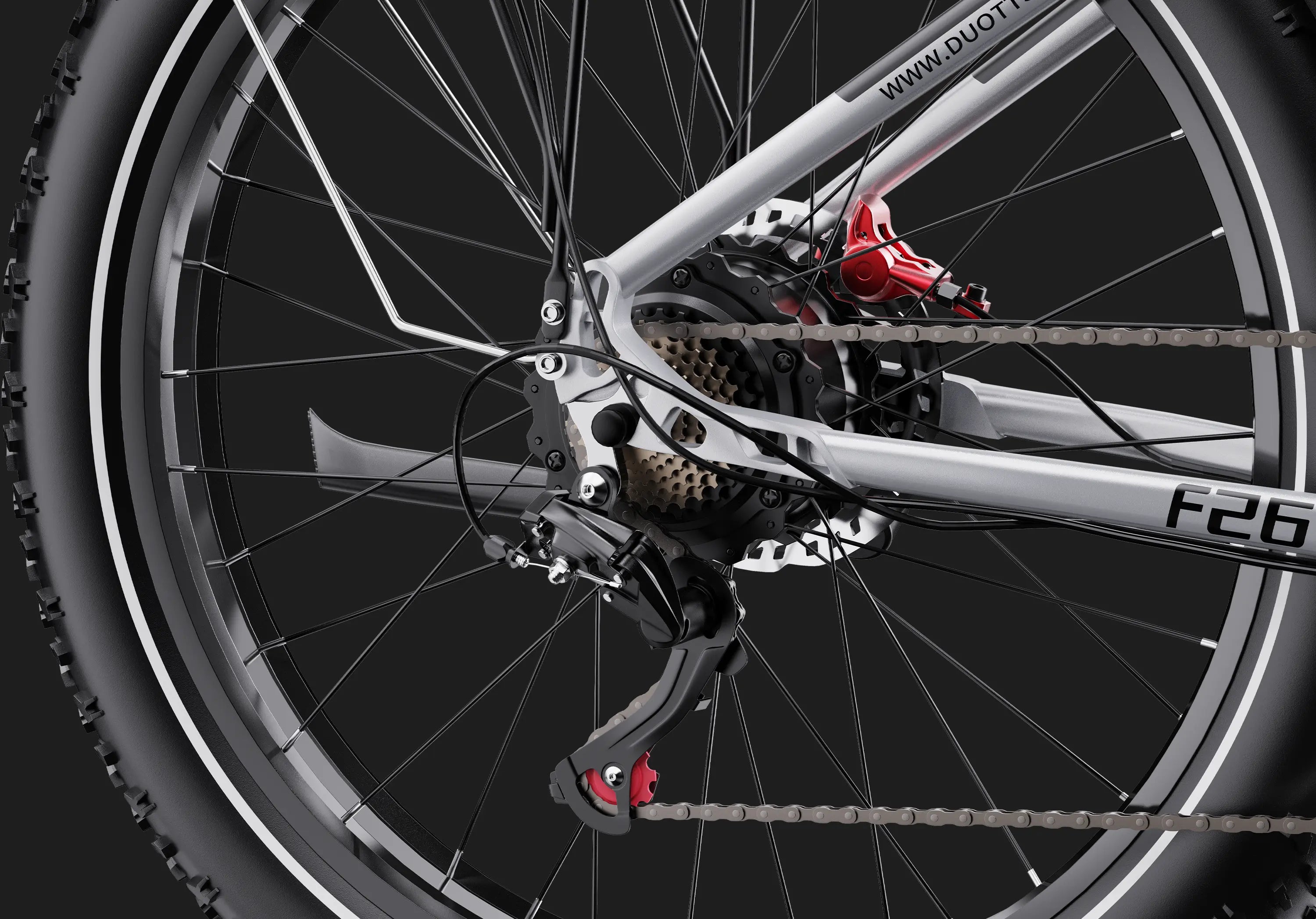 Équipé de moteurs moyeu de 750 W à l’avant et à l’arrière, délivrant un couple de 65 Nm, le F26 offre une traction puissante pour les montées raides, les sentiers accidentés et les conditions de route exigeantes.